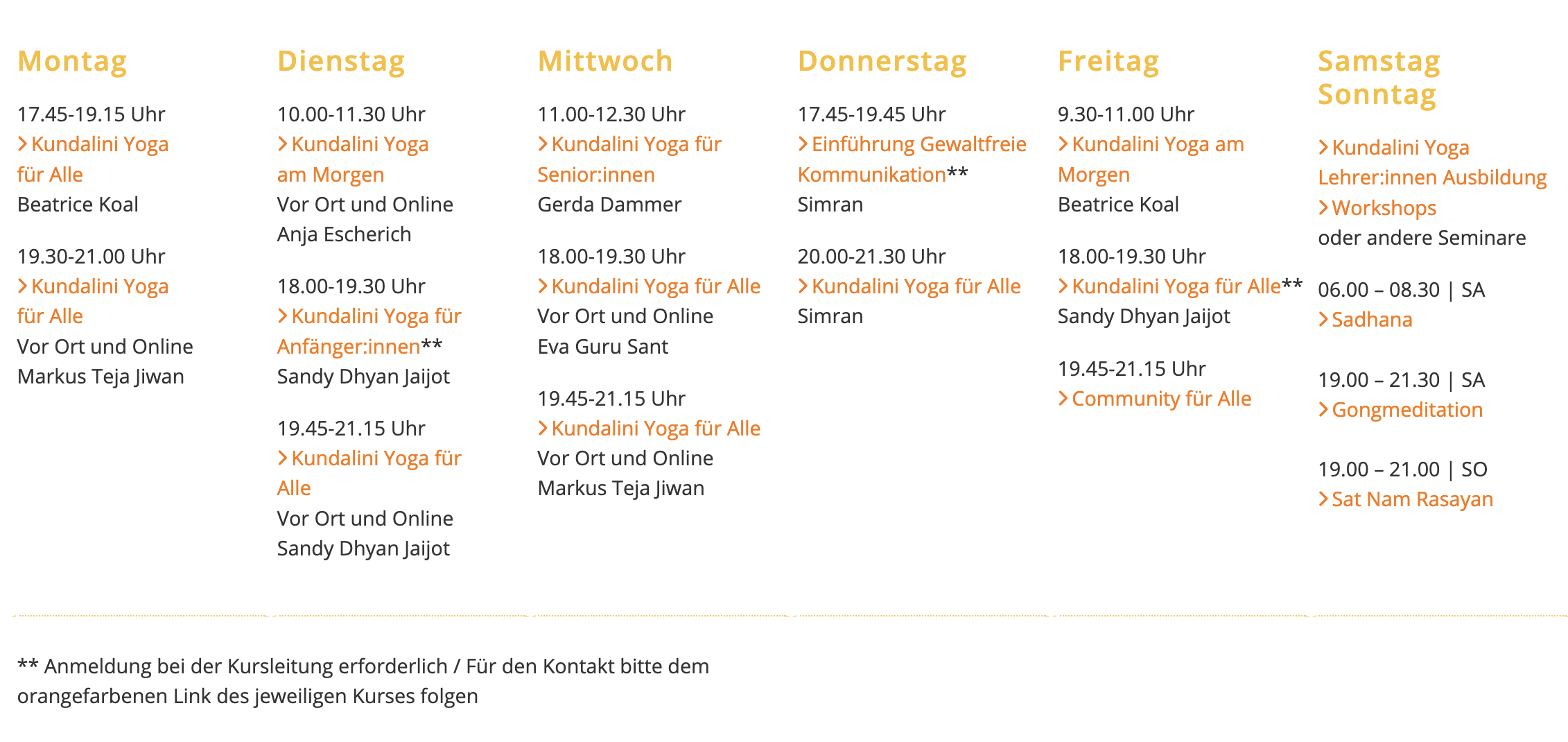 Yoga für Alle / Yoga am Morgen / Yoga für Anfänger:innen / Yoga für Senior:innen / Sat Nam Rasayan / Gewaltfreie Kommunikation / Community / Gongmeditation / Workshops