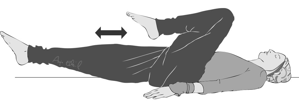 Ausatmen: Das rechte Knie bewegt sich zur Brust, das linke Bein wird ausgestreckt.