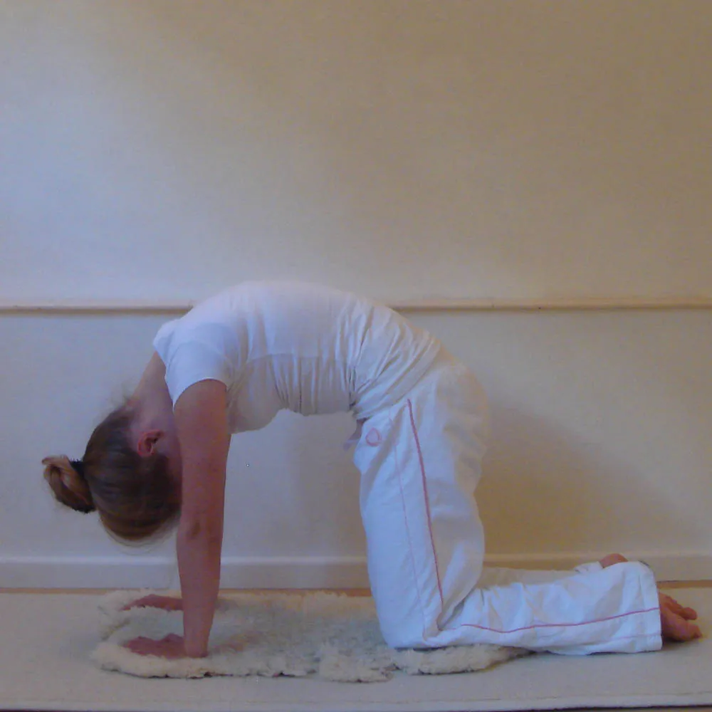 Im Vierfüßlerstand, auf Händen und Knien: Die Knie sollten schulterbreit auseinander stehen. Die Armen bleiben gerade während der Übung (ohne Biegung in den Ellbogen). Lasse Deinen Kopf entspannt Richtung Brust herunterhängen. Atme aus und - ohne Deinen Kopf zu bewegen - biege Deine Wirbelsäule nach unten, atme ein und bewege Deine Wirbelsäule wie ein Katzebuckel nach oben. Mache rhythmische Bewegungen mit kräftigen Atem. Erhöhe allmählich die Geschwindigkeit während Dein Rücken zunehmend geschmeidiger wird.