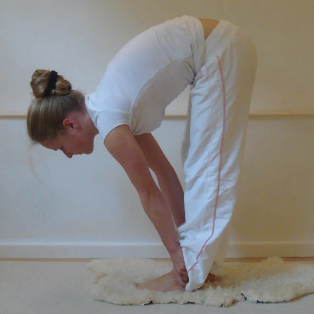 Im Stand: Biege Deinen Oberkörper und fasse Deine Fußgelenke an. Während Du Deine Knie gerade hältst, fange an durch das Zimmer zu gehen.